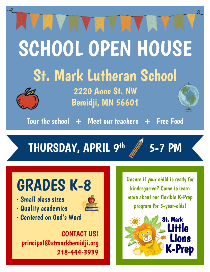 St. Mark Lutheran School offers a Christian education for grades K-8, including a flexible K-prep program for 5-year-olds. Come and take a tour, meet our teachers, and enjoy some free food! Thursday, April 9, 2026 from 5-7 PM. Registration is open for the 2026-27 school year.